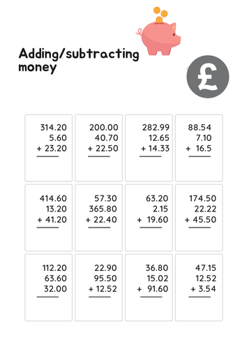 Money Subtraction Worksheets UK Money - Math Salamanders This generator will create money addition worksheets set out in columns. Adding Money Worksheets This generator will create money subtraction worksheets set out in columns. Subtracting Money Worksheets Addition and Subtracting Money problems in columns with a range of currencies. Adding and Subtracting Money Worksheets